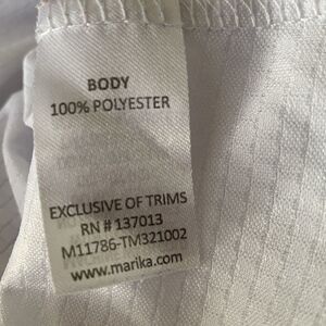 Marika performance top is white with a taupe colored elastic band down the top of back. Material has rows of tiny circles. Back has scoop design. Underarm flat across is 19”. Length is 28”.