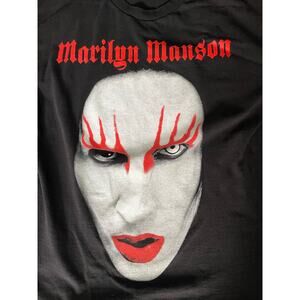 Marilyn Manson band tee featuring a bold front face graphic and gothic red lettering. Classic black shirt made from 100% cotton. Tagged size Large, made in Haiti. No holes or stains; print in great shape. Perfect for collectors of rock and metal tees.