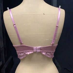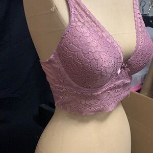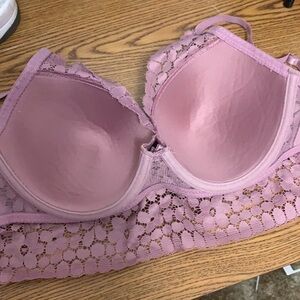 Size 34 C. Lightly padded cups with wire. Lace overlay and lace hangs under cups and around to back closure. Adjustable straps. Very good used condition.
