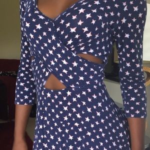 Cut out midi dress, star patterns, navy blue dress, rayon and spandex material, stretchable, soft, very high quality.