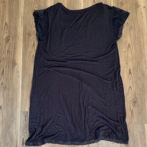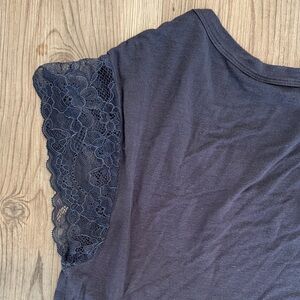 Elegant navy tee with lace short sleeves. Ideal for stylish comfort.