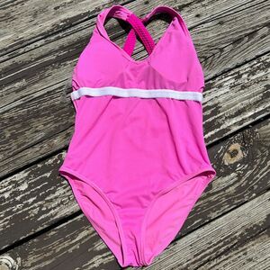 * V-neckline, braided hot pink criss-cross back straps, built in shelf bra with removable pads, fully lined & typical stretch that swimwear has