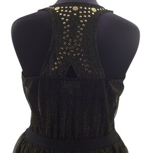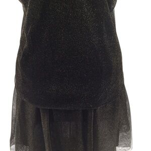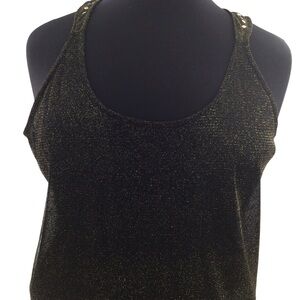 two-piece skirt set., skirt has elastic waistband with pleated tulle skirt with gold sparkles, Fully lined Top has T style back with small triangle cut out, back panel has round gold studs on back and shoulder material is shear also has gold sparkles very pretty and feminine size XL