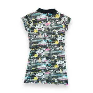 This Marilyn Monroe polo shirt features a stylish all-over print and snap front closure. Made from a blend of cotton, polyester, and spandex, this shirt is comfortable and perfect for casual occasions. The short-sleeved shirt has a collared neckline and button accents to complete the look. It is available in size XS, although it fits like a size 16. The shirt is manufactured in China and is perfect for any Marilyn Monroe fan.