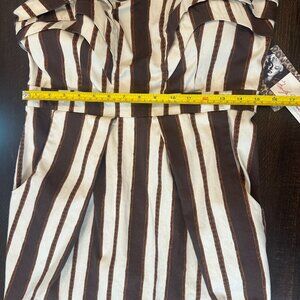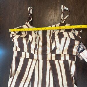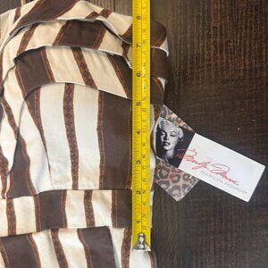 This Marilyn Monroe sleeveless dress is brand new with tags and in excellent condition, with no stains, no tears, and no visible wear. It features bold vertical brown and cream stripes, a fitted bodice with structured seams, adjustable shoulder straps, and a flattering pleated skirt that falls to a classic knee length. The dress is a women’s size Large and perfect for both casual outings and semi-formal occasions. Color may vary slightly based on lighting.