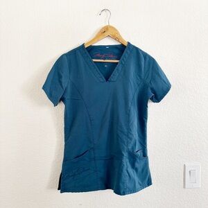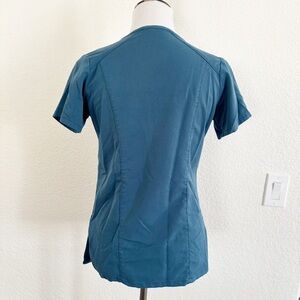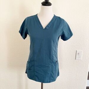 Teal V-neck top with short sleeves. Comfortable and stylish. Ideal for casual wear.