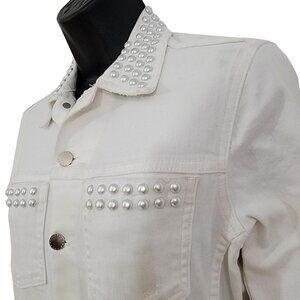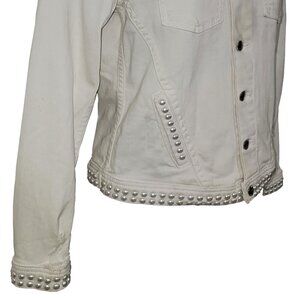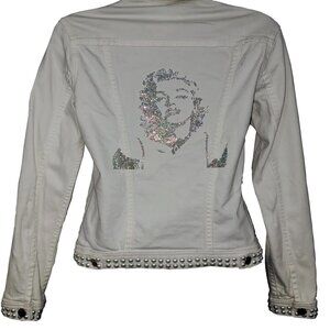 Custom designed beautiful women's white denim jacket, luxury brand, embellished with brass metal pearlized studs and hotfix crystals Marilyn design on the back, jacket has some distressed patches to add a rocker but glamorous look...
