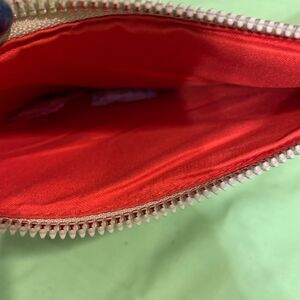 Metal Logo 8”h x 12” width x 5.5” depth . Nude outside Red liner inside both bags. Faux Leather zippered closure big bag has a long adjustable shoulder strap. Both are New with tags