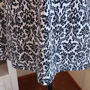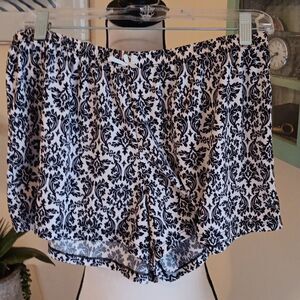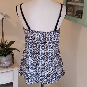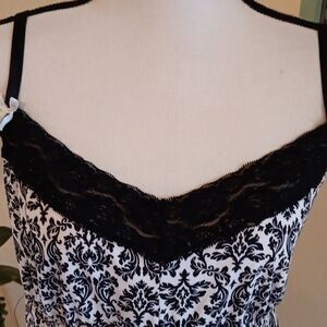 So pretty. Blush and black with leafy arabesque graphics. Elastic at waist of tap pant bottoms. The top has gathers under chest, lace at top with bows. Adjustable straps. Comfy and soft. Size M-L measures 36-42 at chest. 32-38 under chest, 46 at bottom hem. 25 long from shoulder to hem. Pants: 30-40 at waist. 12.5 inseam. Very soft.