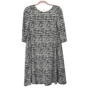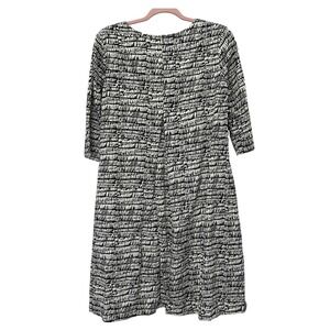 Chic Marimekko dress featuring a striking black and white print. This stylish dress has a flattering A-line silhouette, a comfortable round neckline, and practical three-quarter length sleeves. The dress is fully lined and features a concealed back zipper for a seamless look.