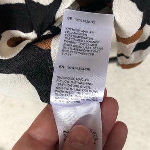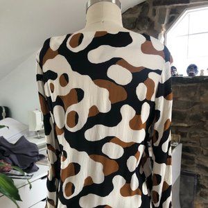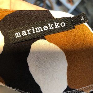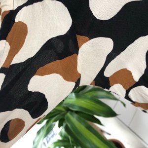 This Marimekko Pauli blouse features cream, saddle tan, and black abstract print. It has gathered sleeves and is in excellent used condition. I wore a handful of times and washed on gentle cycle and always laid flat to dry.