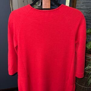 The dress has short raglan sleeves and vertical seams in the front, which give a streamlined, tailored shape. It has a relaxed fit, hits just below the knee, has a modest crewneck neckline and 3/4 length sleeves.