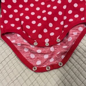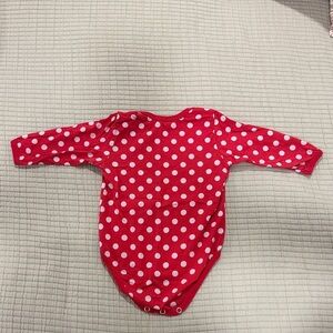 Charming red bodysuit with grey polka dots. Long sleeves. Snap closure for easy dressing. Very good condition, no spots or stains or tears.