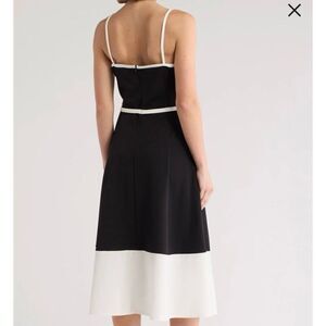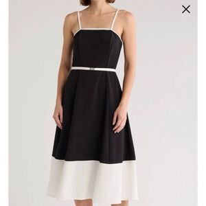 Marina black and white color block belted midi part dress.