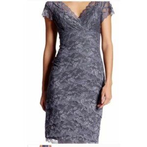 This pretty dress is from Marina in a petite size 12. Anne Ferriday style stretch lace. Gunmetal gray stretch lace with silver sequins scattered about. Unlined sleeves.