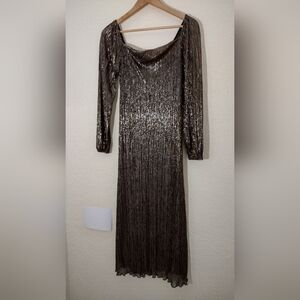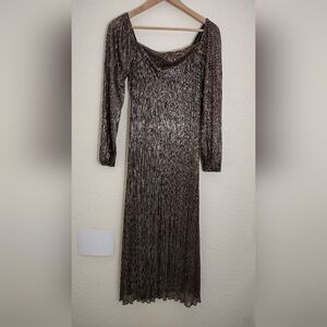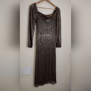 Shimmer in style with this elegant metallic dress. Perfect for evening events, this dress features a stunning gold hue that catches the light beautifully. The sheer sleeves add a touch of sophistication. Elevate your wardrobe with this timeless piece.