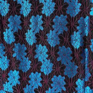 Plus size dress from Marina Kaneva. Blue and red floral lace over brown. Lined. Back zip. Size 18. Approximate flat lay measurements- Bust: 22” across from armpit to armpit. Waist: 19” across. Length: 46”. Gently preowned condition with no tears or stains.