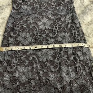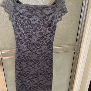 Marina Lace Grey cocktail dress with some sparkling, size 4 of the shoulders Pre-own, In good condition, very flattering. Length-36 Pit to pit-15 Measurements- on the pics. Feel free to ask for more pics or video.:)