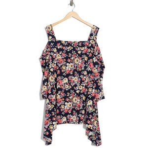 Marina Long Sleeve Floral Print Shark Bite Hem Cold Shoulder Top Plus Size 2X