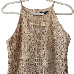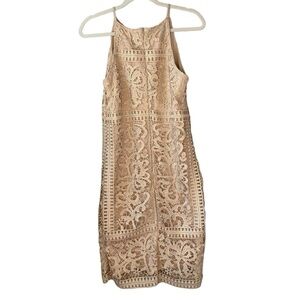 Marina Metallic Champagne Crochet Lace Overlay Halter Dress. EUC Size 8