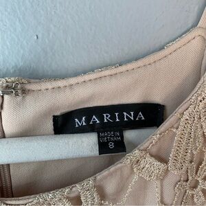 Marina Metallic Champagne Crochet Lace Overlay Halter Dress. Lined. Back zipper closure. Perfect for mother of the bride, wedding, after party, gala, event, party, concert, cocktail, professional. EUC Size 8