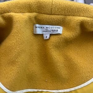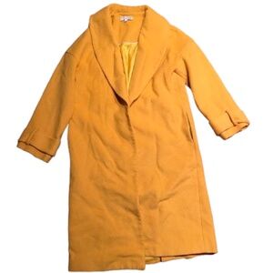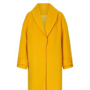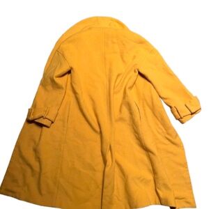 Yellow twill (60% Wool, 40% Polyester). Coat. Collared neck. Long sleeves. Front button closure. 45" from shoulder to hemline. Imported.