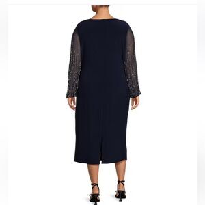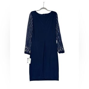 Shimmering beaded accents illuminate the semisheer sleeves of this elegant cocktail dress styled with ruching at the waist for a figure-defining silhouette.