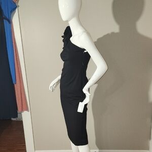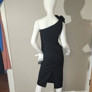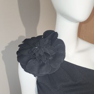 This elegant black one-shoulder dress is perfect for any formal occasion. The stylish design features a beautiful floral accent on the shoulder, adding a touch of sophistication.