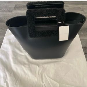NWT Marina Raphael Riviera Tote in coal Napa and shearling. Brand new black leather tote with shearling handles and cross body strap attachment. Top zipper closure with Swarovski crystal accents.