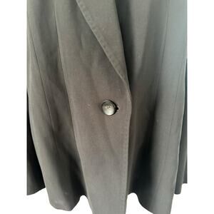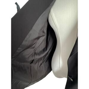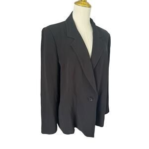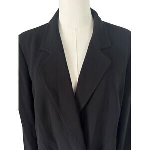 Features/Details: Black, collared, relaxed draped front, singular button front, inner lined, shoulder pads, professional, perfect for the office, long sleeve, button on sleeve, made in italy, vintage