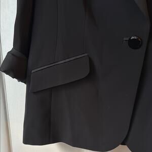 Black single button blazer jacket. Cuffed sleeves. Oversized lapel details.
