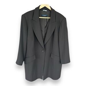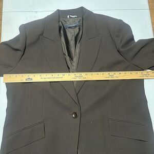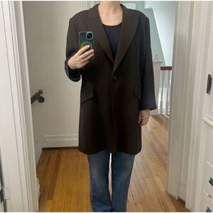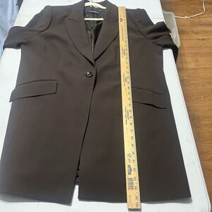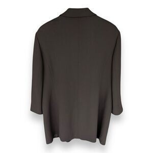 Super high quality brown jacket/blazer in a blend of 50% wool and 50% rayon by the Italian designer Marina Rinaldi. Size 16 US (25 in Rinaldi sizing.) Notched lapel, one button closure, flap pockets, shoulder pads. Hits mid-thigh on a 5’8” person. Can be worn inside or out. Excellent used condition - no flaws detected. See photos for fabric tag and measurements. Approximate pit to pit: 24.5”; length: 35.5”; hips laid flat: 23.5.”