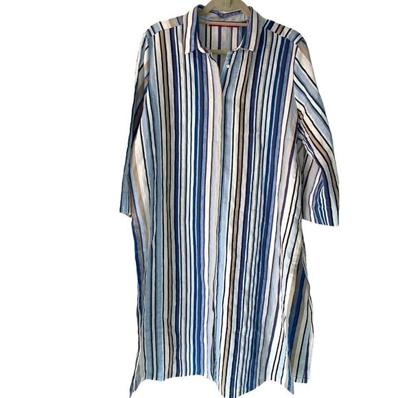 Cotton and linen mix long tunic dress with vertical stripes, deep side slits, and a button-through front.