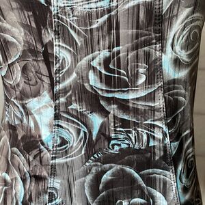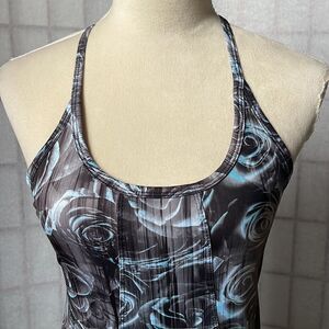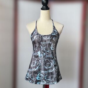 This Racerback tank top has black, white, gray and blue floral designs throughout the fabric. It has a good amount of stretch to it, and besides a couple of loose threads, it is in excellent condition.