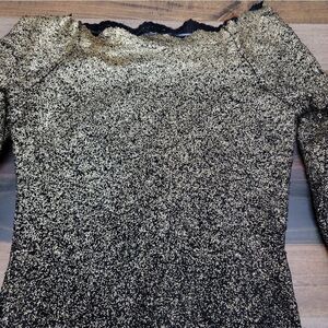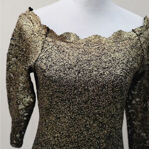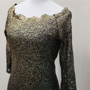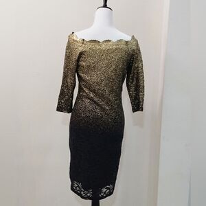 Marina Ladies Two Toned black & Metallic Gold Ombré Lace Pattern Lined Midi Dress Event 3/4 Laced Sleeves & a Scalloped Boat Neck Size 8. Black lining slip. The glitter is in the fabric and doesn’t brush off or feel scratchy.