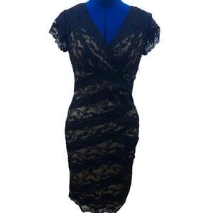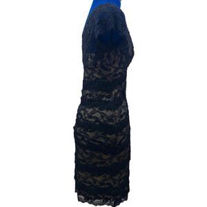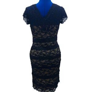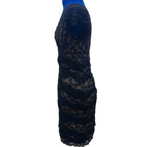 A beautiful black lace covered in shiny beading sits atop a nude colored underlayer.