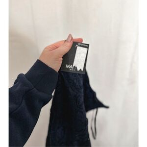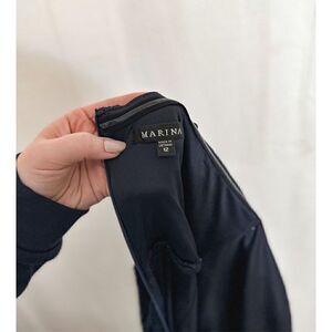 Marina cocktail dress || new with tags || strapless with silicone lining to keep in place || size 12 and is true to size. I’m a 10 for reference and the dress is pulled together in the back for the photos || navy lace || sits just above the knee on me-I’m 5’4 ||