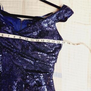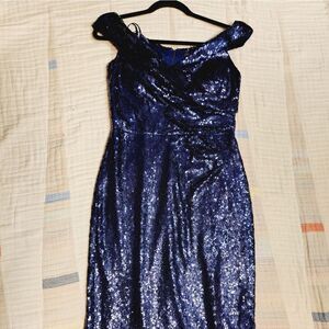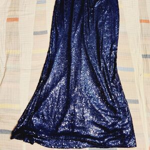 Marina sequined floor length long off shoulders gown with shawl collar, side pleated breast , back zip closure , lined, padded caps.
