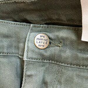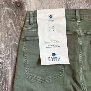 New condition Marine Layer 5 Pocket Athletic Fit Twill Pant/ Color Faded Olive,measurements laying flat waist 15.5”/hips 18”/rise 10”/inseam 30”/length 40.5”/leg opening 7”