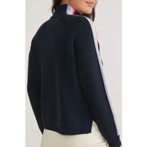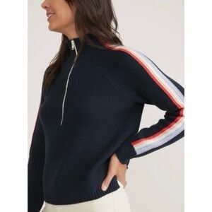 Multi-hued stripes race up the sleeves of a sporty cotton-blend sweater fashioned with a half-zipper and neck-warming stand collar.