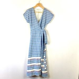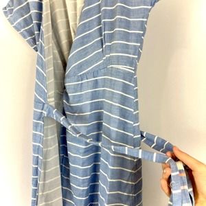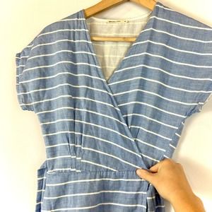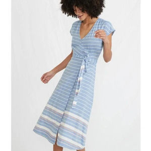 Chic midi dress with a flattering V-neck. Features a stylish tie waist. Perfect for casual outings.