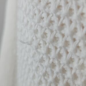 MINOR FLAWS: There are a few snagged threads. A small area of discoloration is on the right arm. It was hard to capture on camera and goes nearly undetected. All shown in pictures.