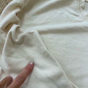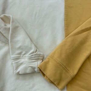 Super soft sweatshirt. Color blocked yellow and off white color on the website is Ochre. There are 2 very minor spots, they are hard to notice, have pointed out in pictures. Other than that, excellent condition.