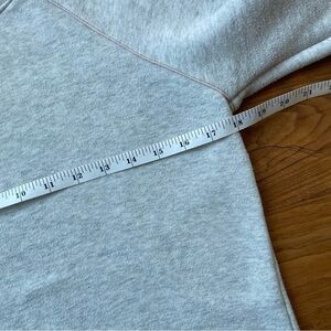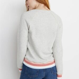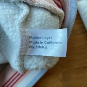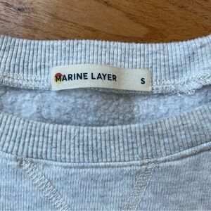 Marine Layer heather gray classic crewneck sweatshirt. Great everyday staple. Cute striped banding at the wrist and hem. Fit is classic, not oversized or shrunken. Preowned with wash wear and pilling throughout. See photos for condition and measurements.