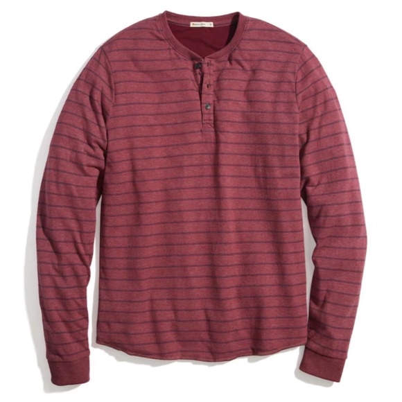 Brand new with tags, Men's size Medium and XL / X-Large. This Marine Layer Double Knit Cordovan Navy Long Sleeve Henley Top is classic and timeless. Love the cordovan burgundy red with navy blue stripes. The double knit, tri blend jersey fabric is so soft and comfortable. Has a 3 button closure at the neckline. Ribbed at the neckline and sleeves.