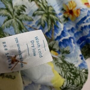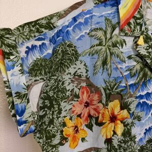 This listing is for a Marine Layer Malia Button Down Blue Hawaiian Print Short Sleeve Button Up Shirt. All-over ocean/rainbow/floral print. Lyocell/Linen.