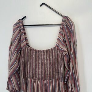 Square neck puff sleeve midi striped dress with smocked bodice. Side pockets.