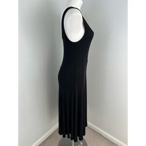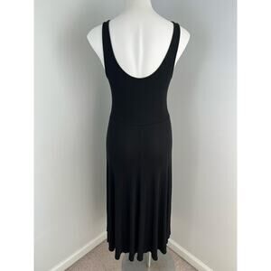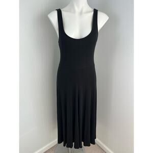 Tank dress with scoop neck, ribbed knit material, fitted waist, and flared skirt. Fully lined.