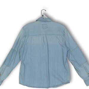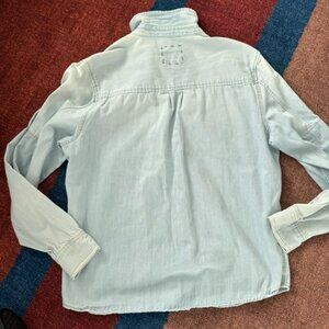 Marine Layer “Marge” shirt in soft, lived-in chambray. Size Medium. Lightweight Tencel blend with snap buttons and chest pockets. Easy, versatile layer in excellent condition. Wear it open over tanks, tucked into high-rise jeans, or tied at the waist over a dress. Great for summer travel, layering into fall, or back-to-school wardrobe building.