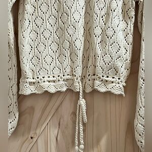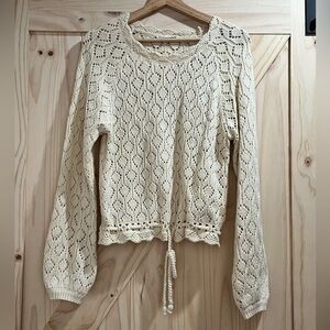 “This new sweater stepped straight outta the '70s. This crochet top has beautiful puffed sleeves, a relaxed fit, and a drawcord waist. Topped with delicate details, this knit pairs perfectly with your favorite flares for a vintage-inspired look. “